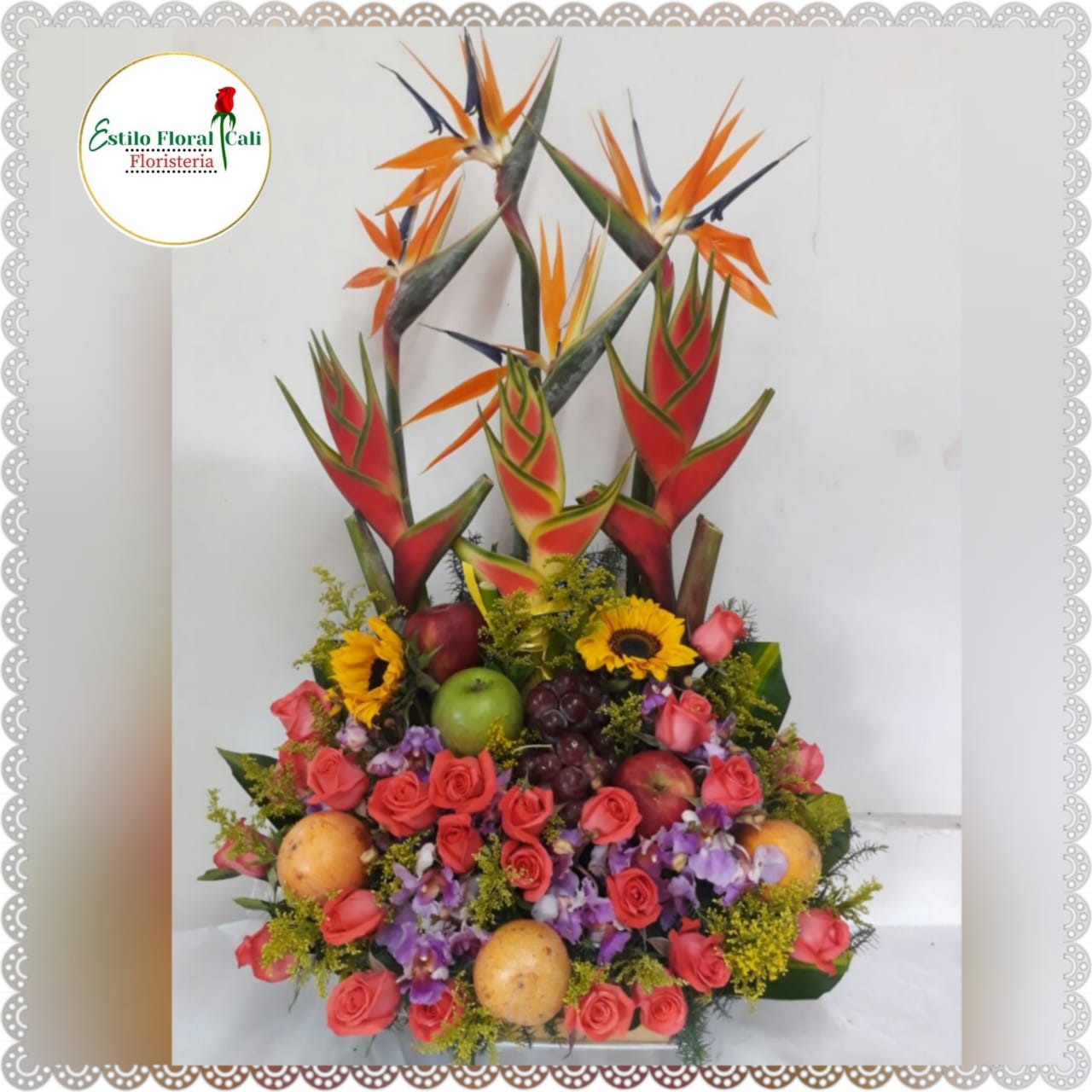 Rosas salmon, girasoles, aves del paraíso, eliconias, orquideas, frutas, moño y tarjeta