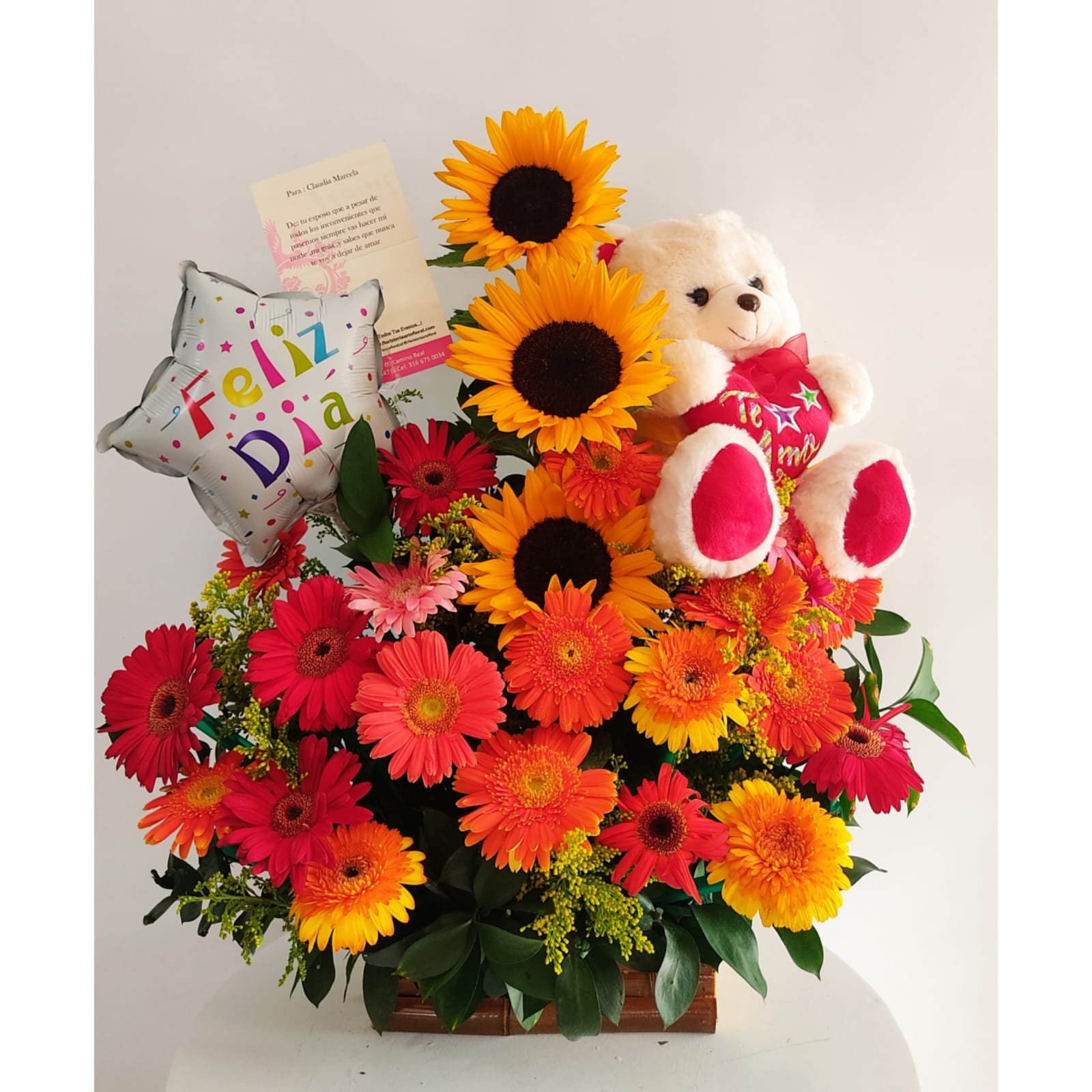 Arreglo floral de Garberas y oso  y  tarjeta impresa