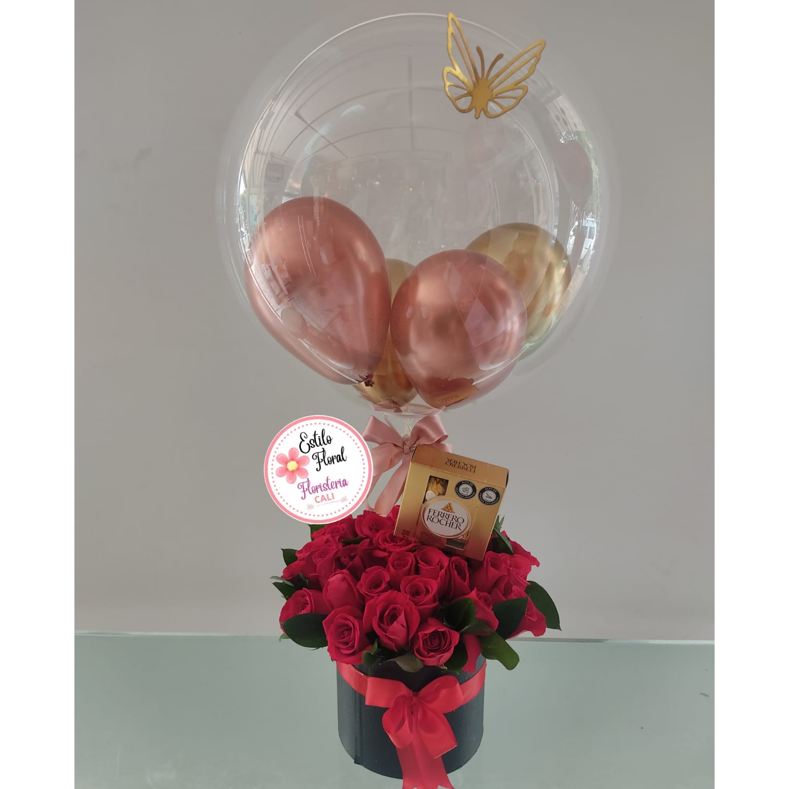 Cilindro rosas rojas, ferreros y globos – floristerias en cali