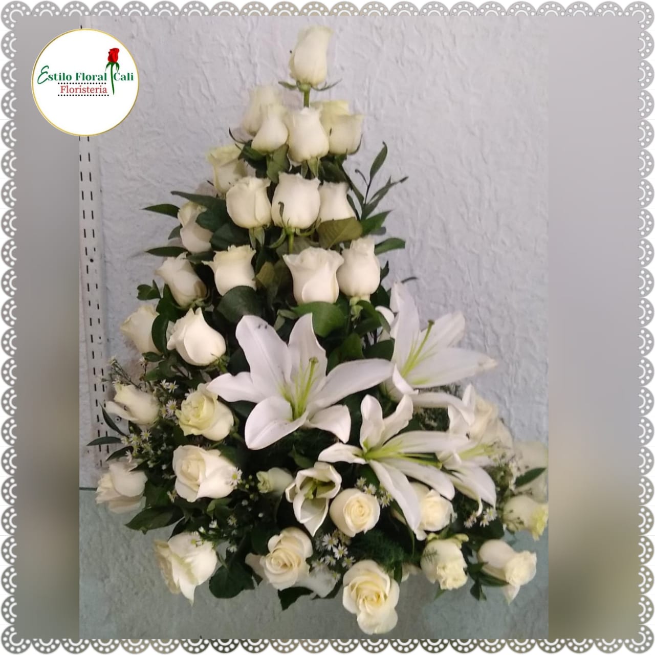 Rosas blancas,lirios moño y tarjeta