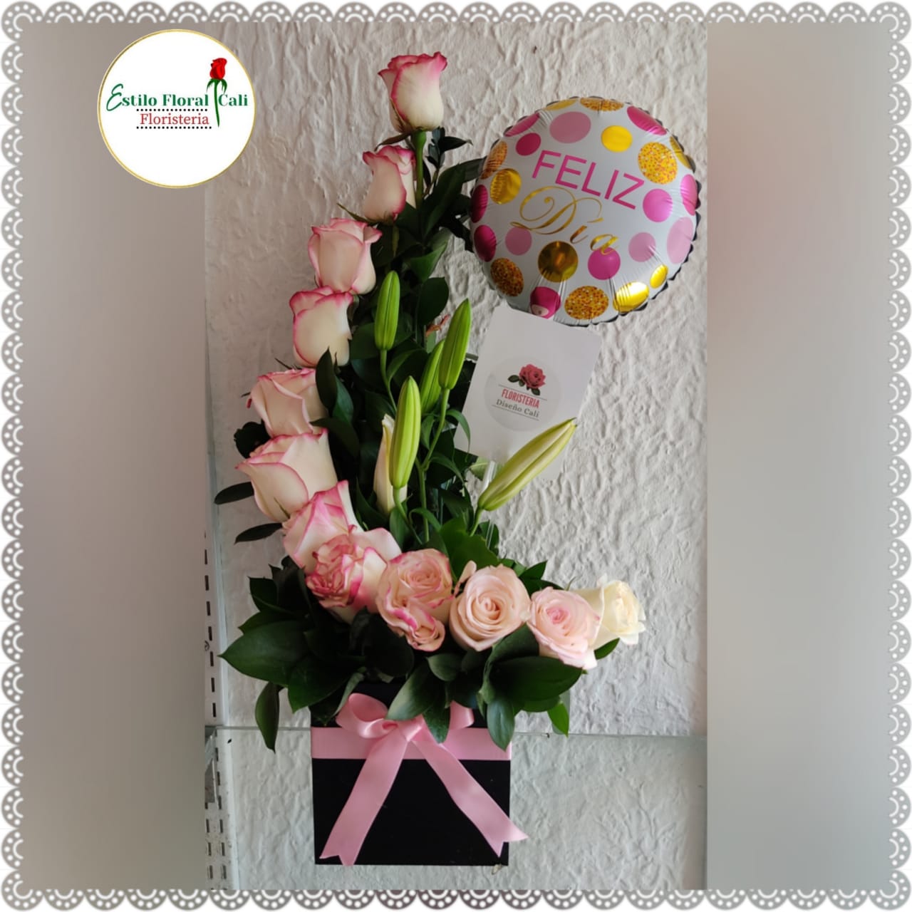 Rosas rosadas, lirios, moño, globo y tarjeta