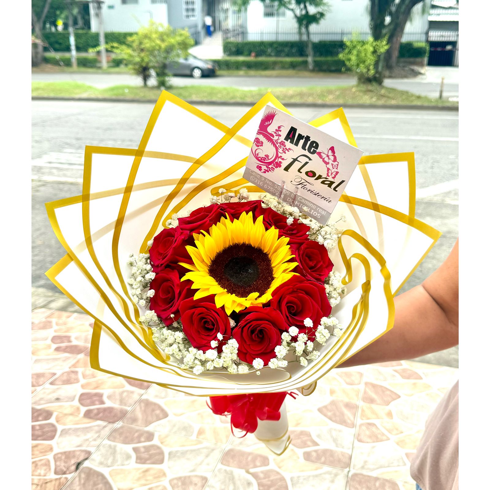 Ramo buchón  rosas y girasol y tarjeta impresa