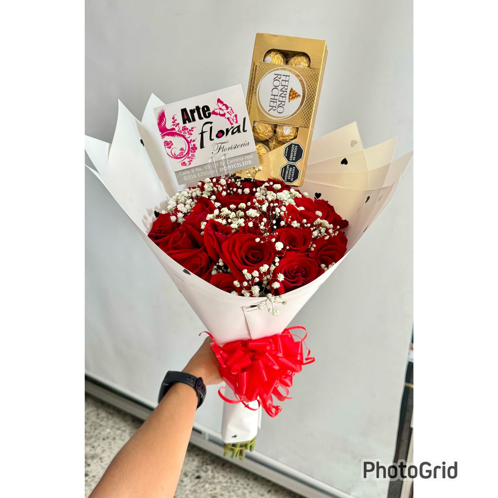 Ramo buchón de 24 rosas y chocolates ferreros y tarjeta impresa