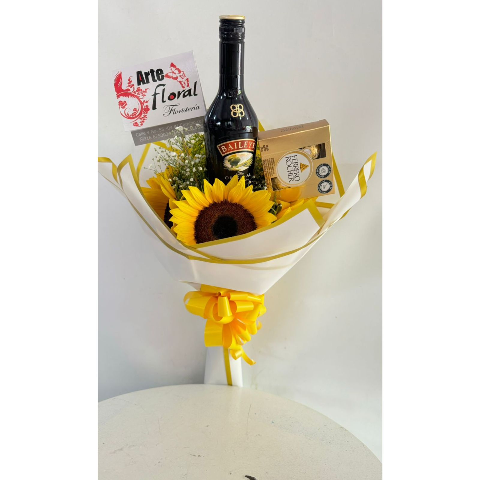 Ramo buchón de girasoles, chocolates ferreros, licor  y tarjeta impresa