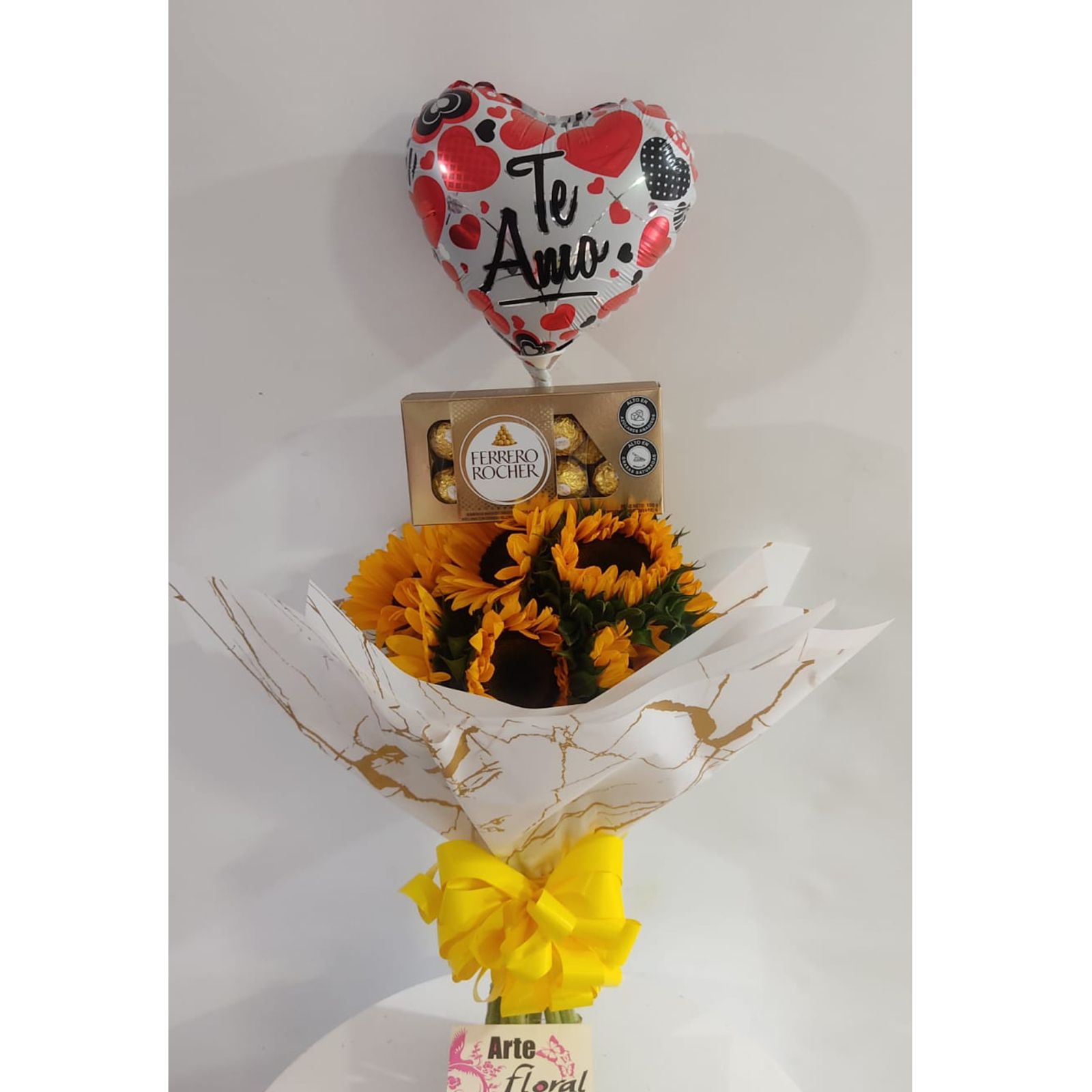 Ramo buchón y ferreros  y globo burbuja y tarjeta impresa